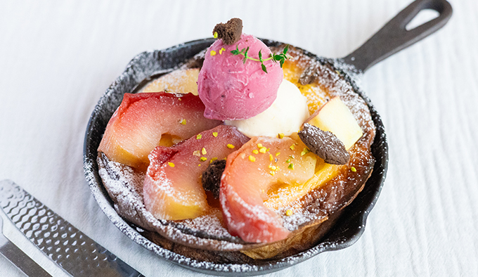 ふんわり焼き上げたダッチベイビーに、じっくり煮込んだりんごのコンポートとフレッシュりんごを合わせました。ベリーのアイスとバニラアイスを添え、温かさと冷たさが重なる贅沢なひと皿です。