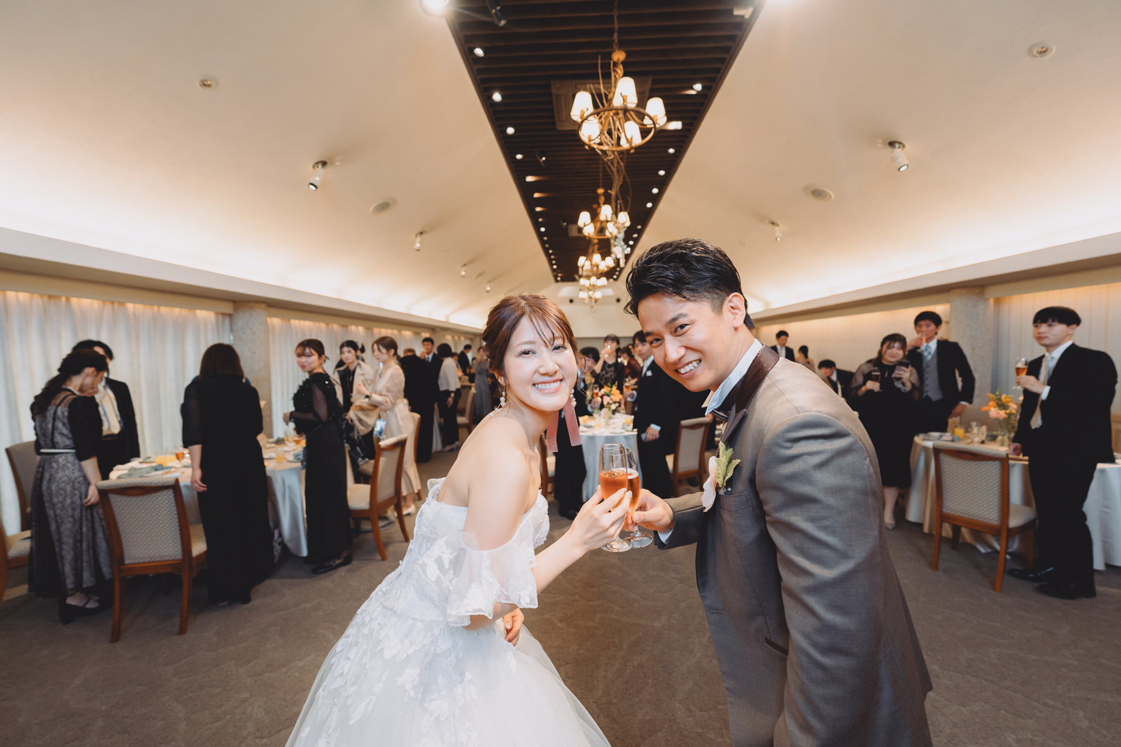 パーティーがスタートしたあとは、各テーブルにおふたり自らおもむいて写真撮影や歓談で、ゲストの皆様との時間をたっぷり楽しみました。