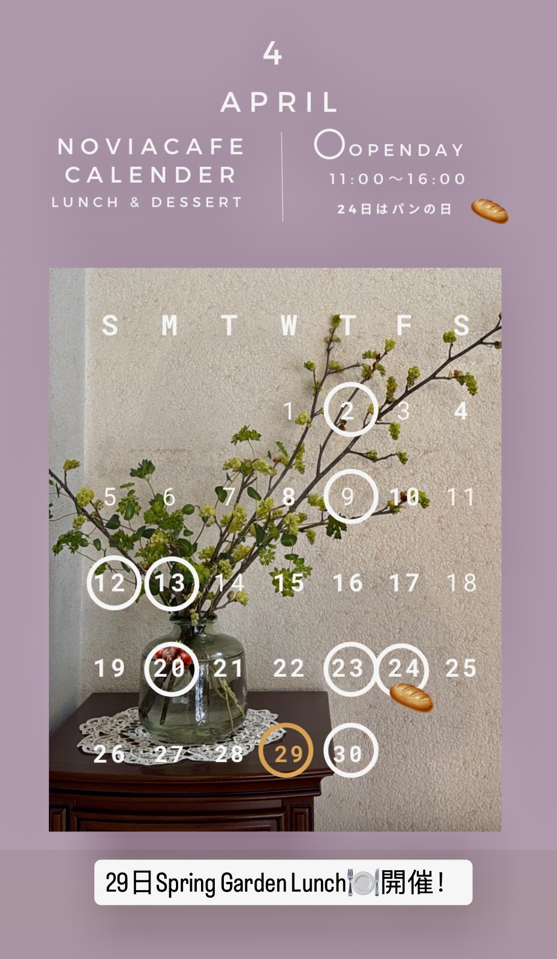 ご予約状況により変更になる場合もございますので、最新情報はノビアカフェの〈 Instagram 〉のハイライトをご参照くださいませ。